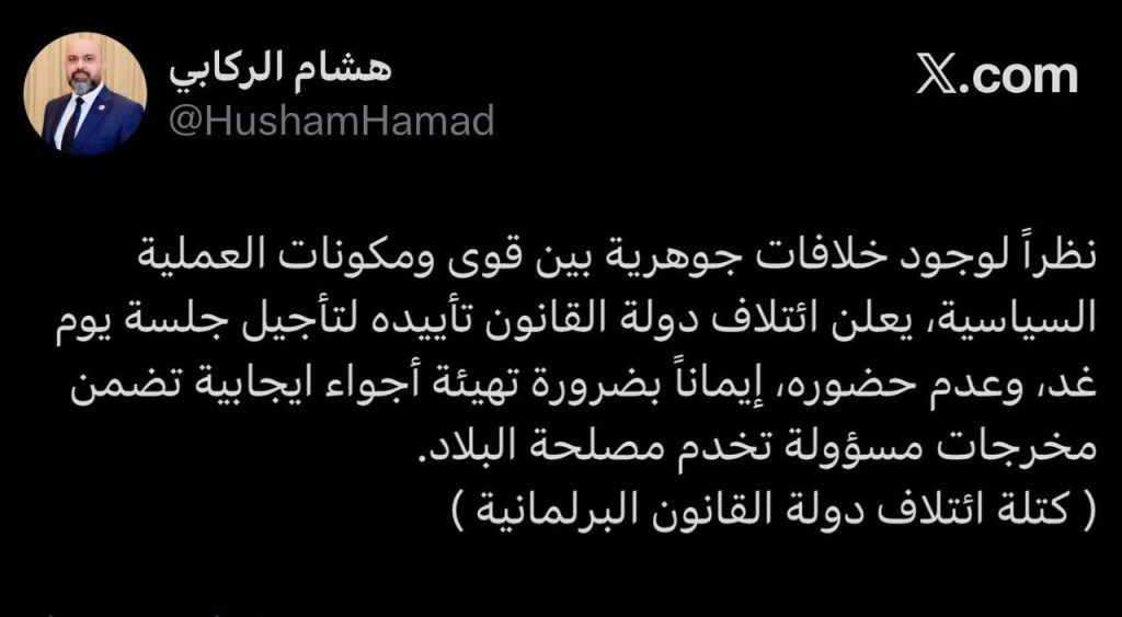 تدوينة مدير المكتب الإعلامي لائتلاف دولة القانون، هشام الركابي، على منصة “X”: