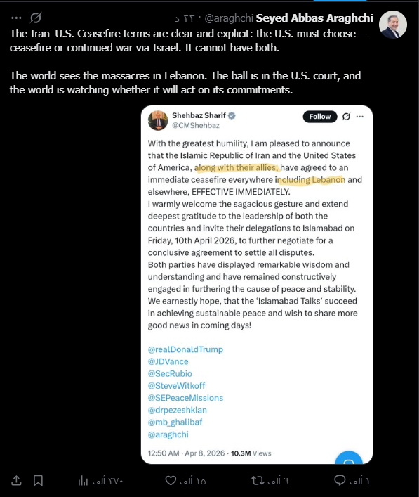 قال وزير الخارجية الإيراني عباس عراقجي، اليوم الأربعاء، إن على أمريكا الاختيار بين وقف إطلاق النار أو استمرار الحرب عبر إسرائيل ولا يمكنها الجمع بينهما، وذلك رداً على استمرار الهجوم الإسرائيلي على لبنان، مشدداً على أن وقف إطلاق النار كان يشمل لبنان، مستدلاً بتدوينة رئيس الوزراء الباكستاني شهباز شريف، والتي أكد فيها شمول لبنان بوقف إطلاق النار، كما لفت عراقجي إلى أن العالم يرى المذابح في لبنان، والكرة في ملعب الولايات المتحدة، والعالم يراقب ما إذا كانت ستنفذ التزاماتها.