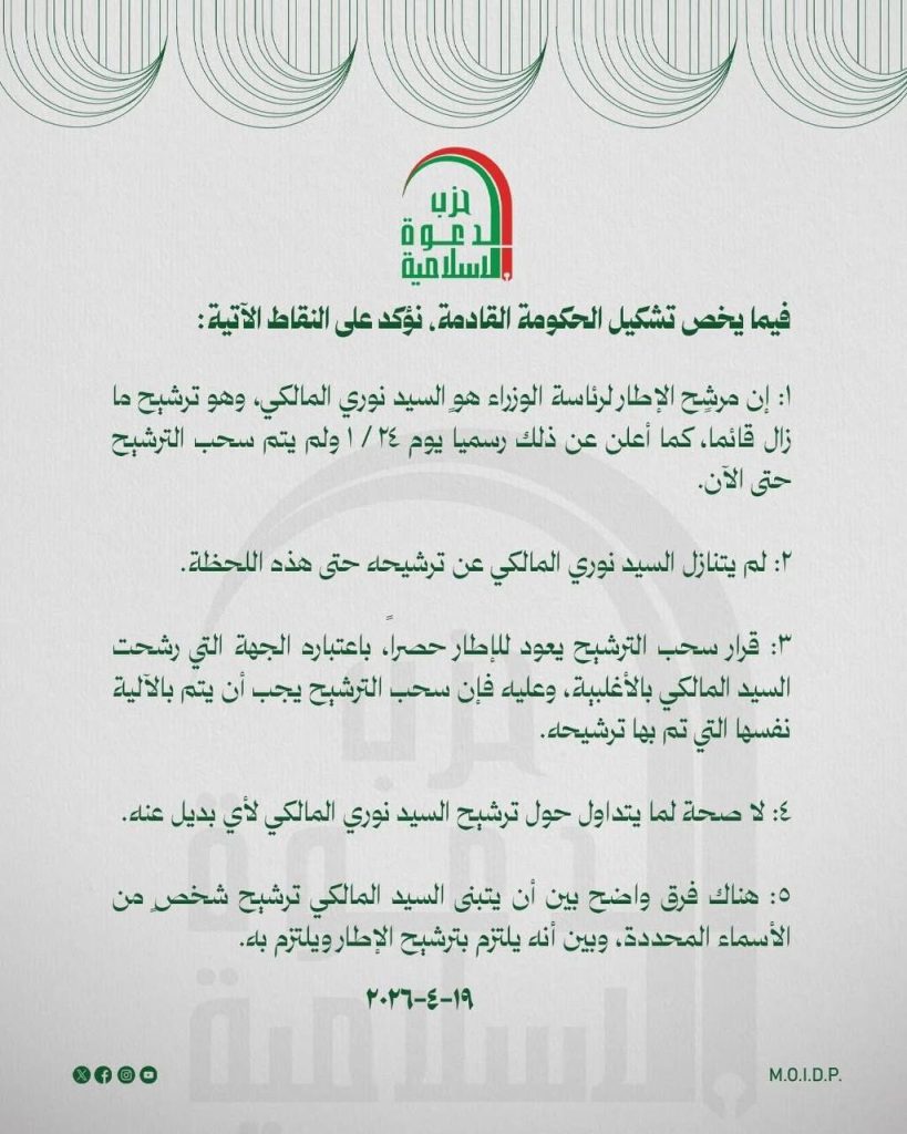 نفى حزب الدعوة، اليوم الأحد (19 نيسان 2026)، تنازل رئيسه نوري المالكي عن ترشحه لمنصب رئاسة الوزراء، مؤكداً أن القرار يعود للإطار التنسيقي باعتباره الجهة التي رشحت المالكي بالأغلبية، وأن سحب الترشيح يكون بالآلية ذاتها، كما شدد على أن الأنباء المتداولة حول ترشيح المالكي لأي بديل عنه لا صحة لها.