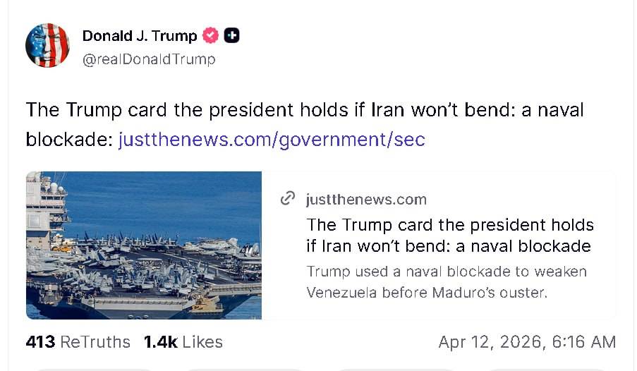بعد فشل المفاوضات بين أميركا وإيران، شارك الرئيس الأمريكي دونالد ترامب مقالاً يتحدث عما وصفها بالورقة الرابحة التي يحملها الرئيس في يده في حال لم تقبل إيران الشروط الأمريكية وهو الإغلاق البحري، وقال، “ورقة ترامب الرابحة إذا رفضت إيران الانصياع: “إغلاق بحري”، كما يتحدث المقال عن قدرة البحرية الأميركية (المارينز) على إحكام السيطرة على كل ما يدخل ويخرج من المياه الإيرانية.