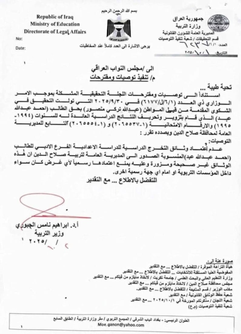 أصدرت وزارة التربية كتابًا رسميًا إلى مجلس النواب تطالب فيه بعدم اعتماد شهادة الإعدادية الخاصة برئيس حزب الجماهير أحمد عبد الله الجبوري (أبو مازن)، مؤكدة أن الشهادة مزورة وغير صحيحة ولا يمكن اعتمادها رسميًا.